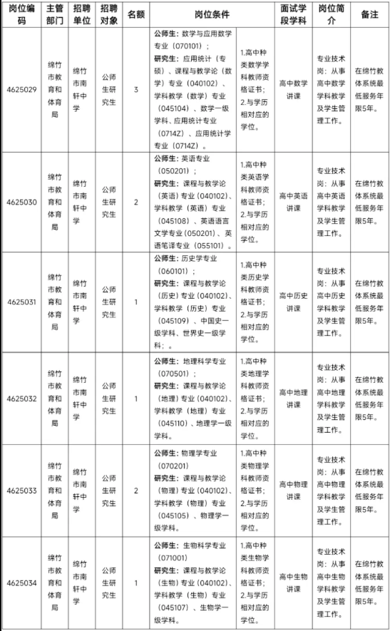 关于报名条件、招聘程序、招聘要求均按照绵竹市人民政府网https://www.mz.gov.cn/《绵竹市人力资源和社会保障局 绵竹市教育和体育局 面向研究生、2026届部属公费师范毕业生公开考核招聘教师的公告》执行。