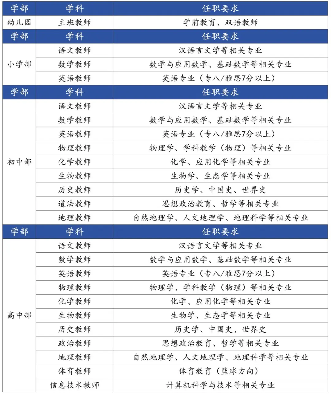 专业能力:具备扎实的学科知识储备,能够独立承担教学任务,拥有较强的课堂组织与管理能力,成熟教师、骨干教师优先;